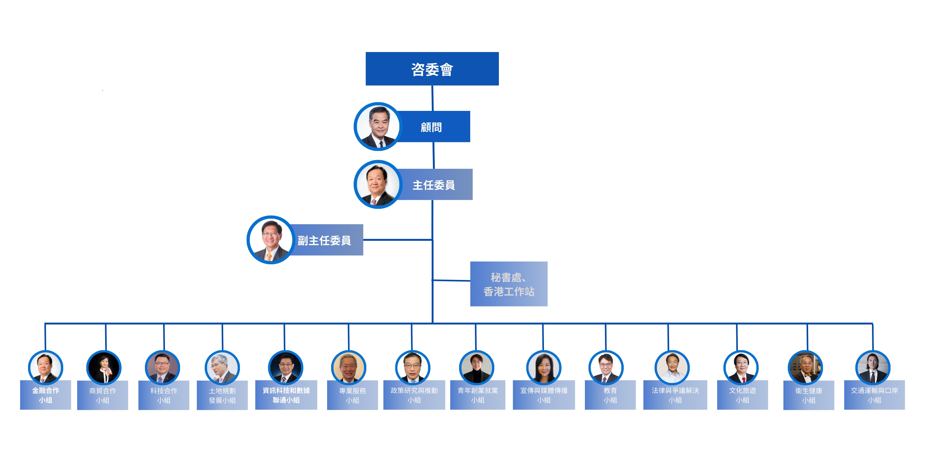 諮委會設顧問1名,主任委員1名,副主任委員2名及委員33名。內設諮委會秘書處和香港工作站,下設金融、商貿、科技合作、土地規劃發展、資訊科技和數據聯通、專業服務、政策研究與推動、青年創業就業、宣傳與媒體傳播、教育、法律與爭議解決、文化旅遊、 衛生健康及交通運輸與口岸等14個專項工作組。各專項工作組設雙組長制,由香港委員擔任港方組長,南沙區牽頭部門分管領導擔任南沙組長,共同推動各專項領域率先合作,形成示範效應。自2021年4月正式成立後,諮委會已先後就土地規劃發展、商貿、金融、教育及數據聯通等方面正式啟動工作。